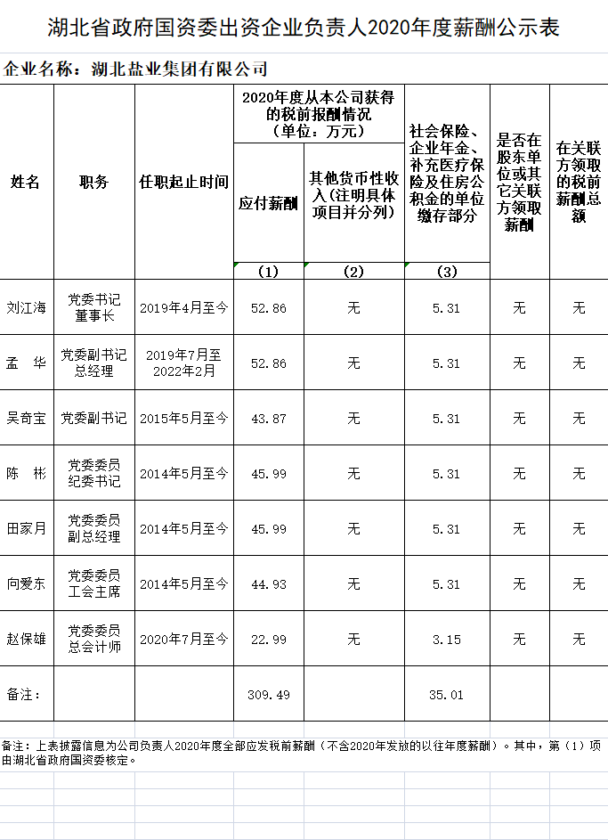 湖北省政府国资委出资企业负责人2020年度薪酬公示